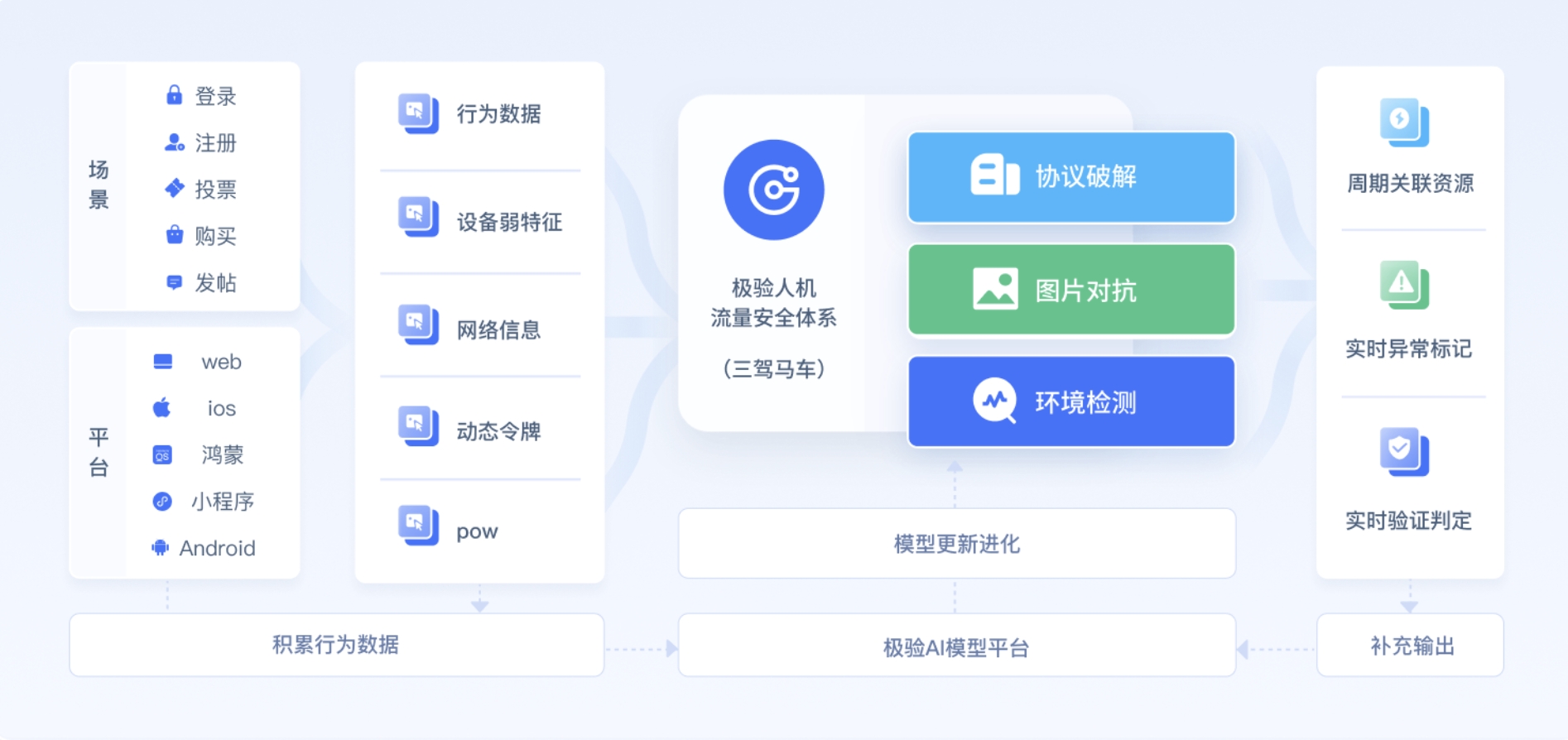 为应对 BotBrowser 等先进自动化工具,极验采用了多层防御模型,该模型集成了基于图像的验证、环境风险分析和动态令牌验证。